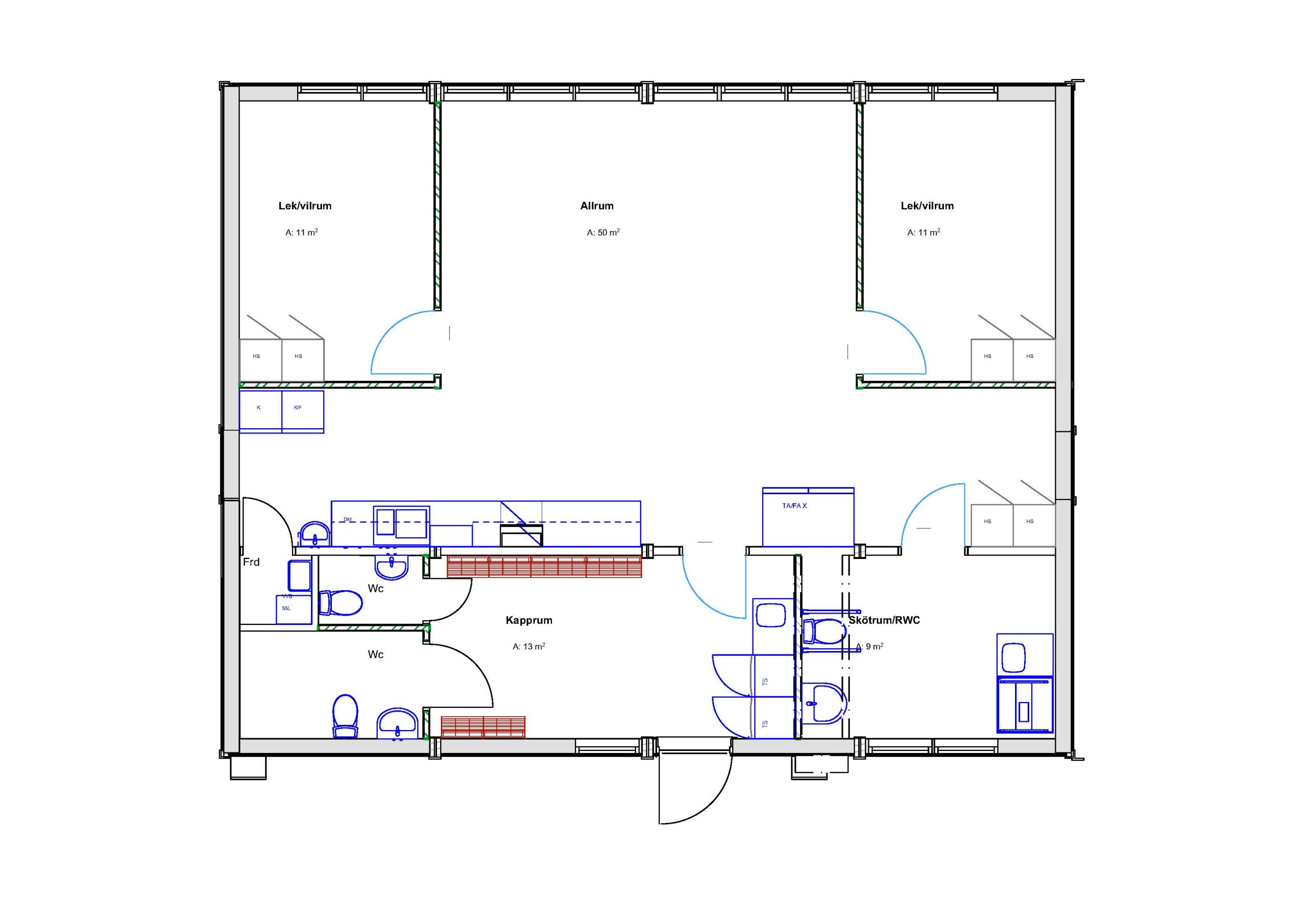 Vi har flera förskolemoduler på lager. Detta är ett exempel på en liten förskoleavdelning med plats upp till 20 barn.